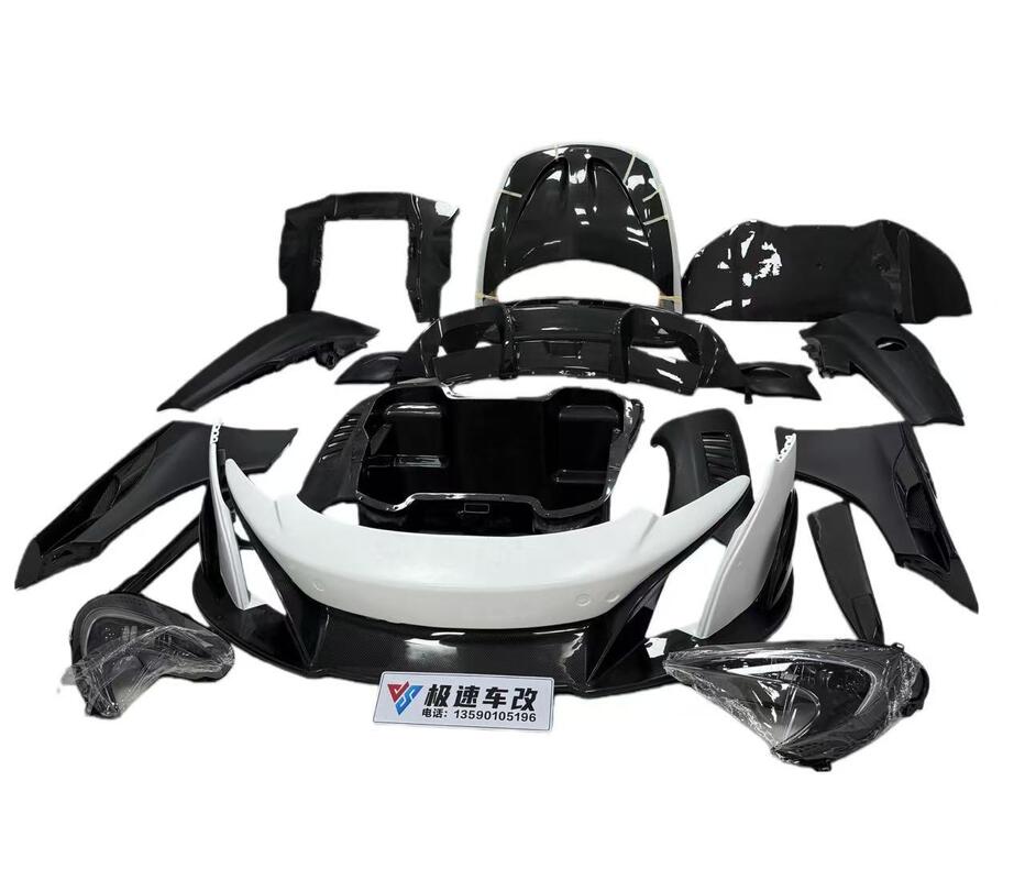 Upgrade your McLaren MP4-12c 650s with this 675LT-style Semi-carbon fiber(FRP+carbon fiber)body kit, including Front and rear bumper side skirts hood fender headlight exhaust system